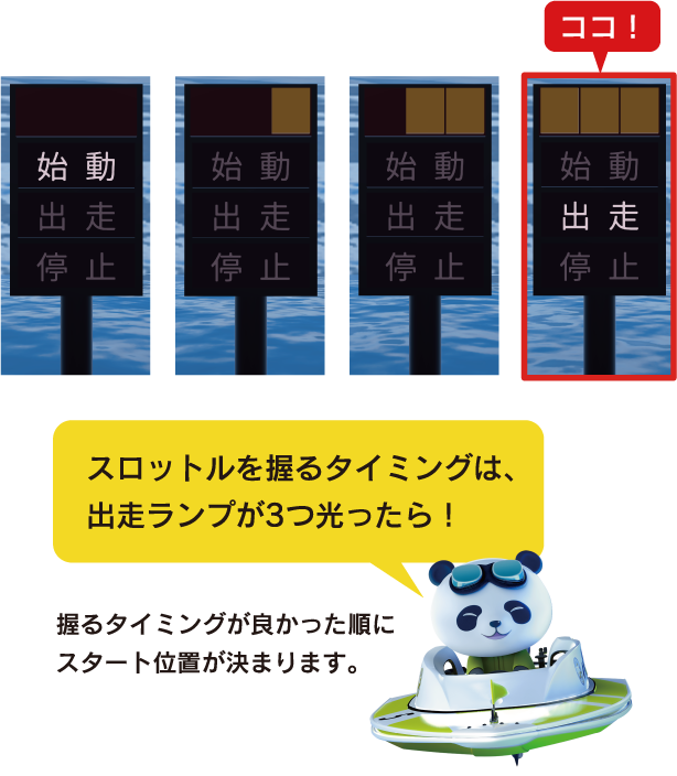 左手で握ります。握り続けると、徐々にスピードが上がっていきます。ターンのタイミングで少しスピードを落とすと曲がりやすくなります。