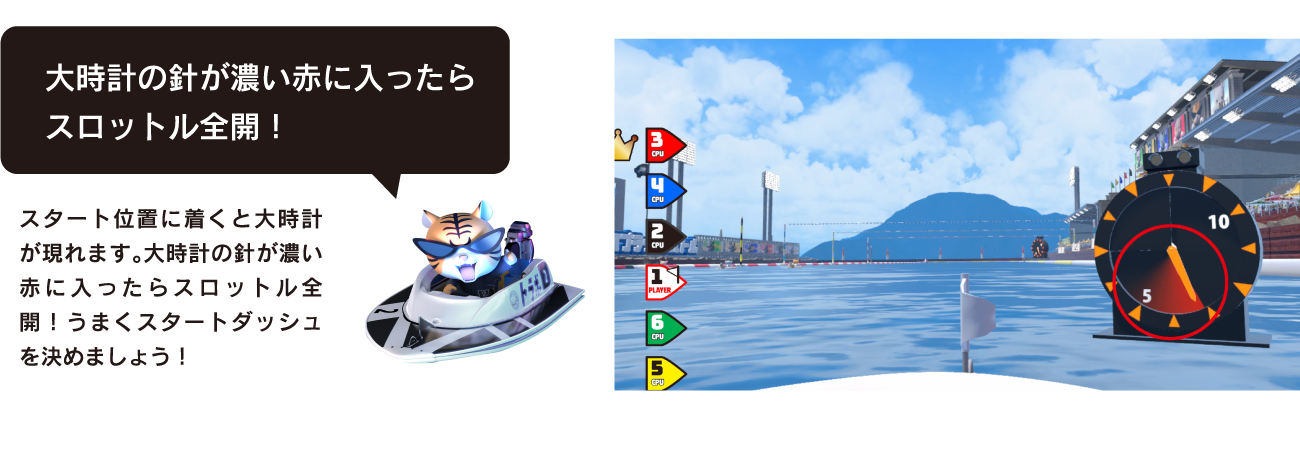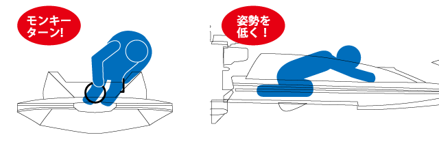 ターンする時は大きく体を左に傾けましょう。実際にレーサーがとる「モンキーターン」という姿勢が有効です!また、直線では姿勢を低くするとスピードアップします。