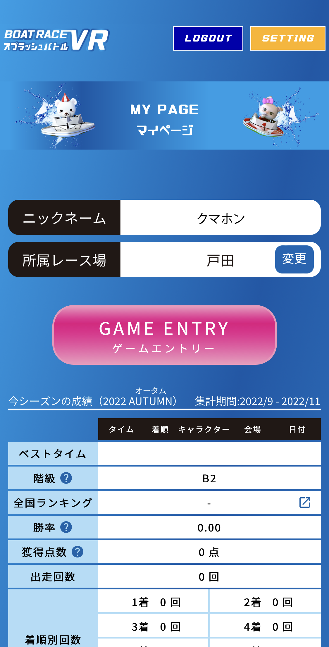 マイページでは自分のレース成績が記録される他、全国ランキングへの登録があります。